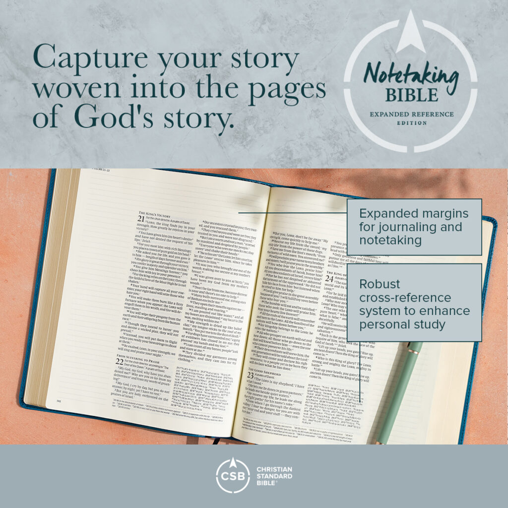 Enhance your personal Bible study or prepare for teaching and preaching with the CSB Notetaking Bible, Expanded Reference Edition. This Bible features an easy-to-read two-column, verse-by-verse setting with a robust cross-reference system and wide journaling margins at both the top and edge of each page to make observations, raise questions, and inspire additional exploration of Scripture.