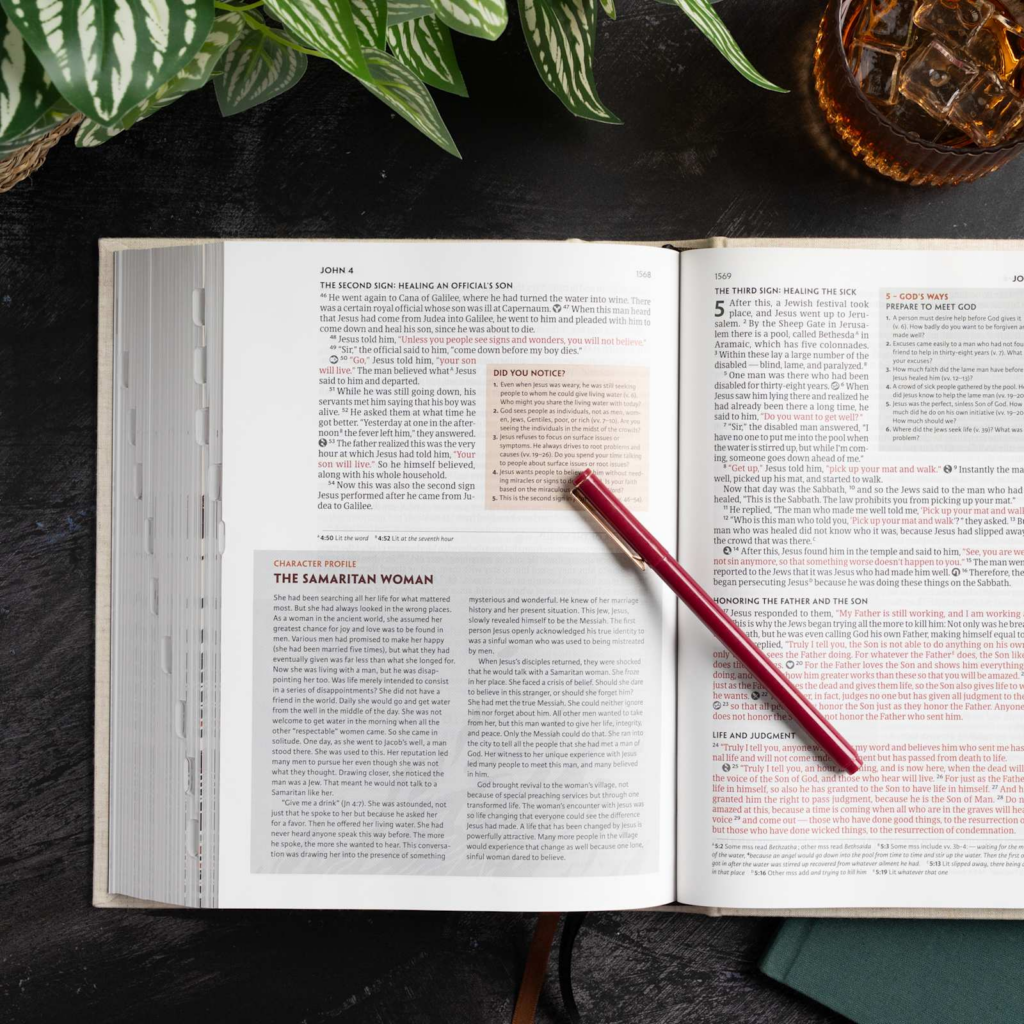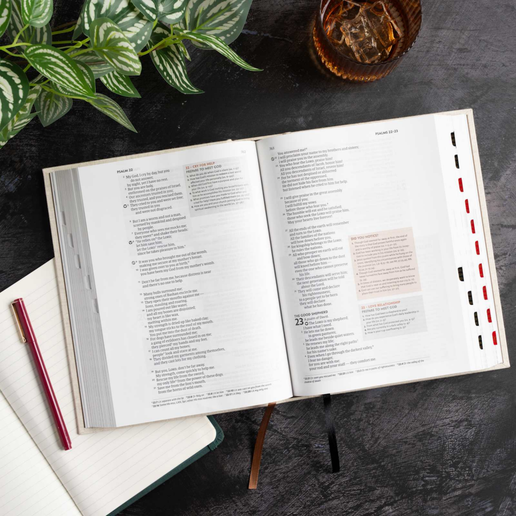 - Designed icons on every page identify select verses that display the seven realities of Experiencing God and two steps of Fresh Encounter found throughout God’s Word