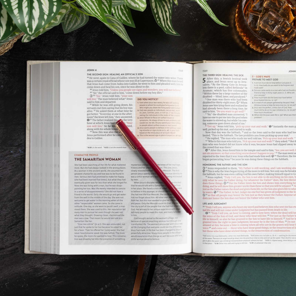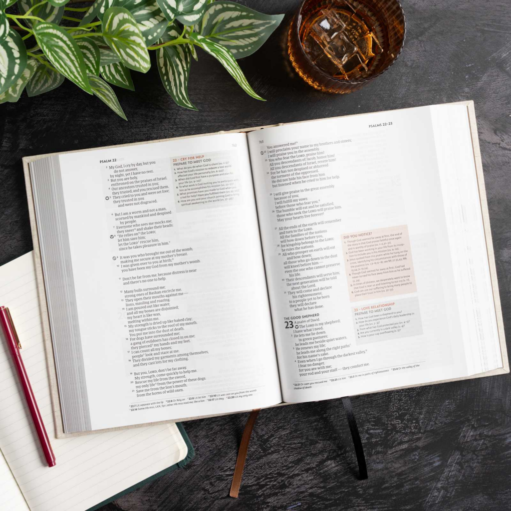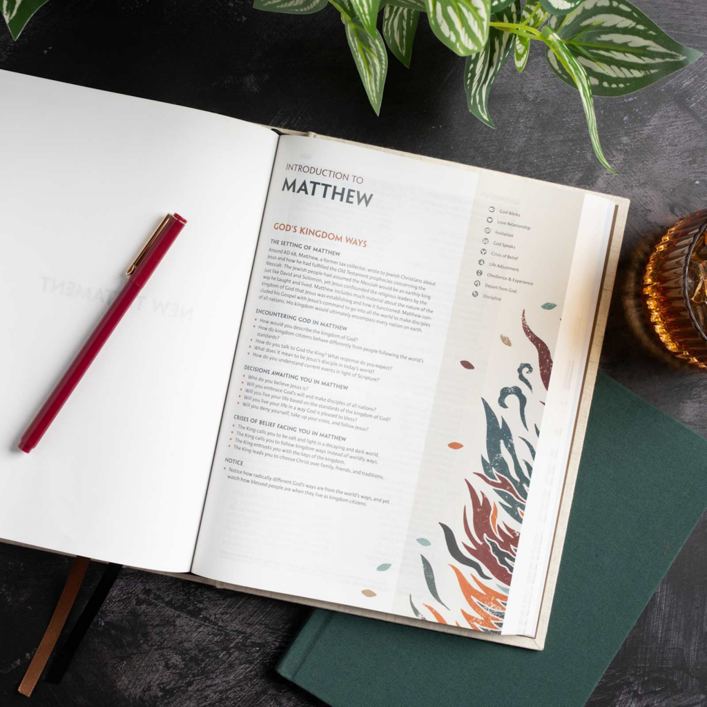 - Designed icons on every page identify select verses that display the seven realities of Experiencing God and two steps of Fresh Encounter found throughout God’s Word
