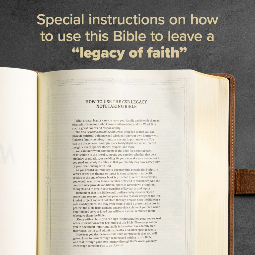 The CSB Legacy Notetaking Bible is intentionally designed to leave a lasting and personalized “legacy of faith” for family, friends, and loved ones. This Bible features an easy to read, single-column setting and provides wide margins for journaling and recording notes, prayers, observations, insights, questions, and other reflections about God’s Word. Beautifully crafted covers complete the package, allowing this CSB Bible to stand the test of time with your legacy of learning and growing inside for generations to come.