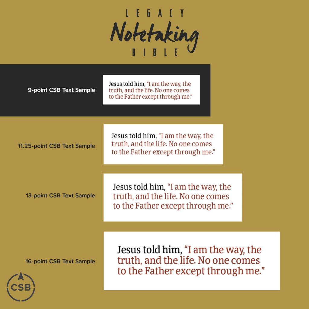The CSB Legacy Notetaking Bible features the highly readable, highly reliable text of the Christian Standard Bible® (CSB). The CSB captures the Bible’s original meaning without sacrificing clarity, making it easier to engage with Scripture’s life-transforming message and to share it with others.
