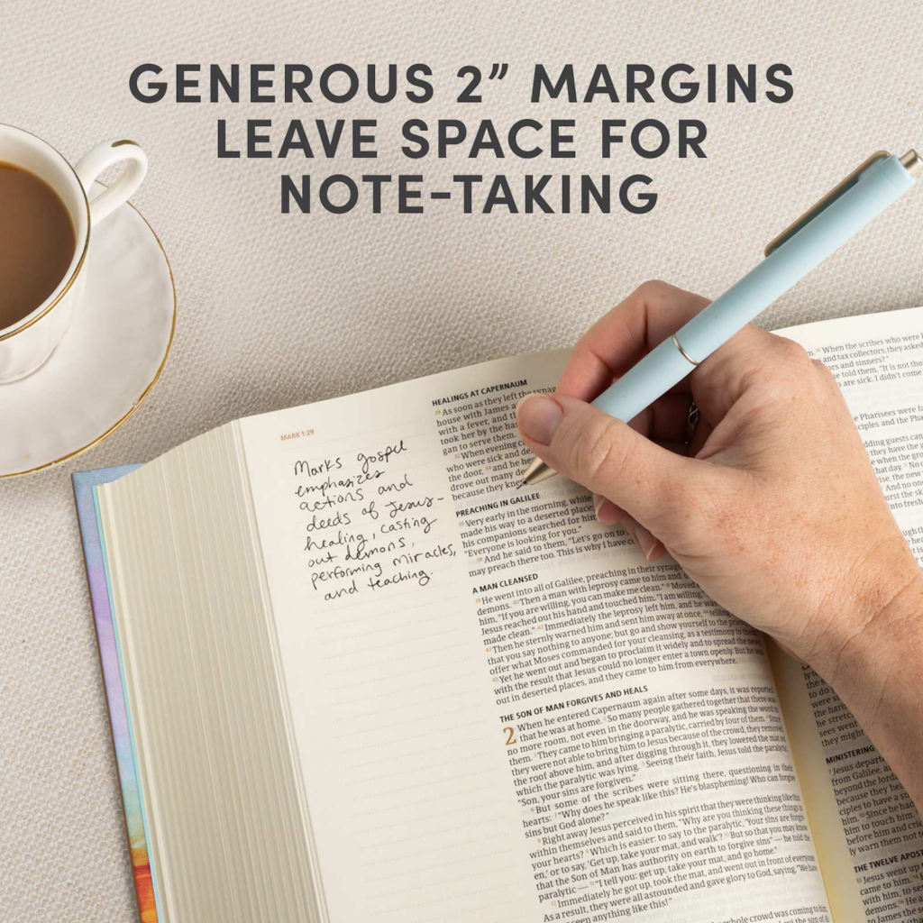The CSB Notetaking Bible, Hosanna Revival Edition is designed in partnership with the creative team at Hosanna Revival. Each cover design is uniquely hand-painted and printed on cloth cover materials paired with a sewn binding and high-quality cream paper meant to record a lifetime of reflections, prayers, and insights. Comparable to popular journaling Bibles, the CSB Notetaking Bible, Hosanna Revival Edition includes an easy-to-read, single-column setting and generous two-inch designed margin space on each page.