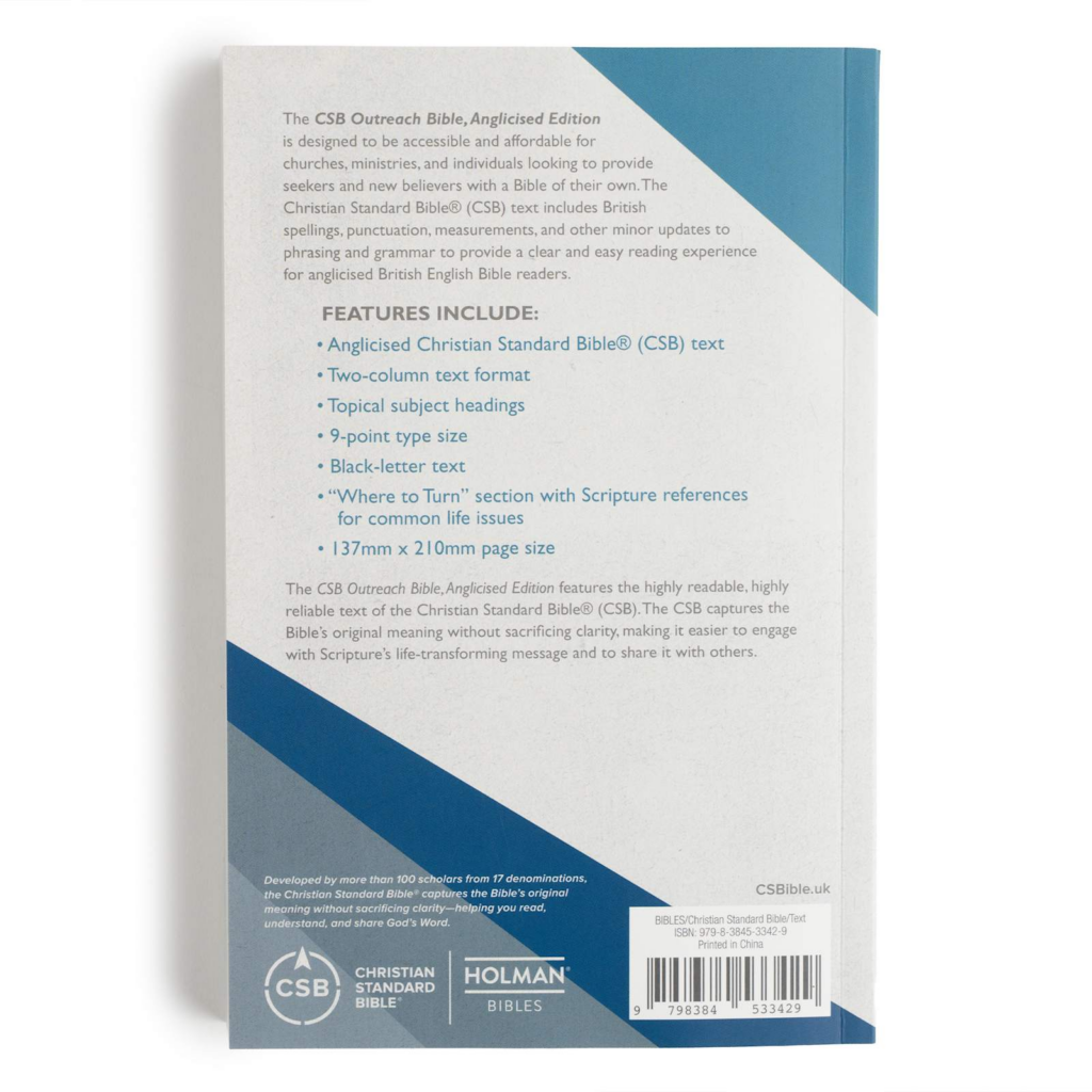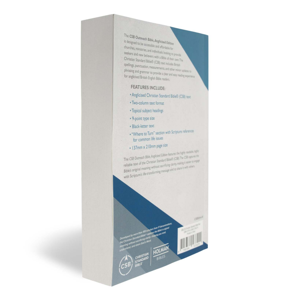 The CSB Outreach Bible, Anglicised Edition is designed to be accessible and affordable for churches, ministries, and individuals looking to provide seekers and new believers with a Bible of their own. The Christian Standard Bible® (CSB) text includes British spellings, punctuation, measurements, and other minor updates to phrasing and grammar to provide a clear and easy reading experience for anglicised British English Bible readers.