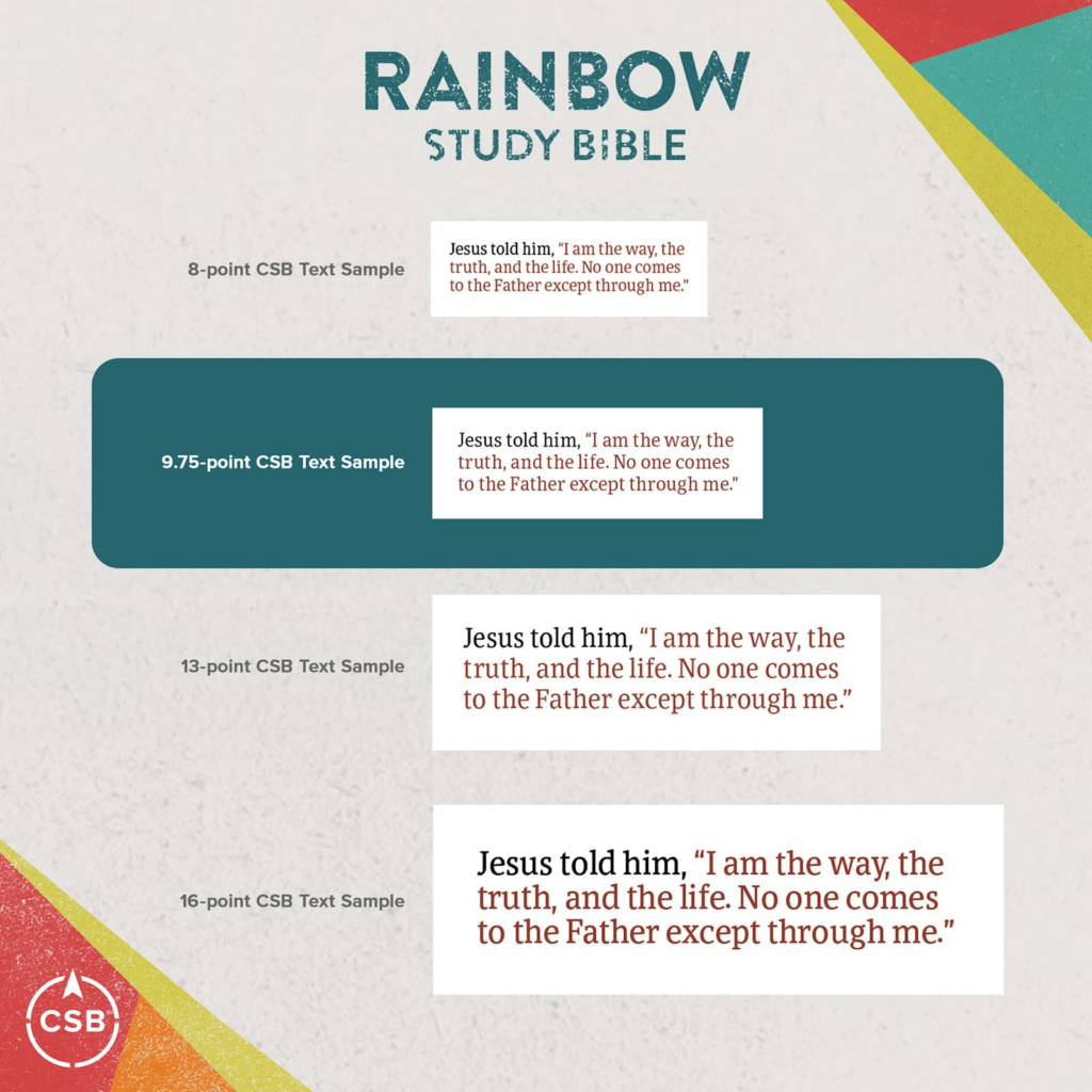 The CSB Rainbow Study Bible features the highly readable, highly reliable text of the Christian Standard Bible® (CSB). The CSB captures the Bible’s original meaning without sacrificing clarity, making it easier to engage with Scripture’s life-transforming message and to share it with others.