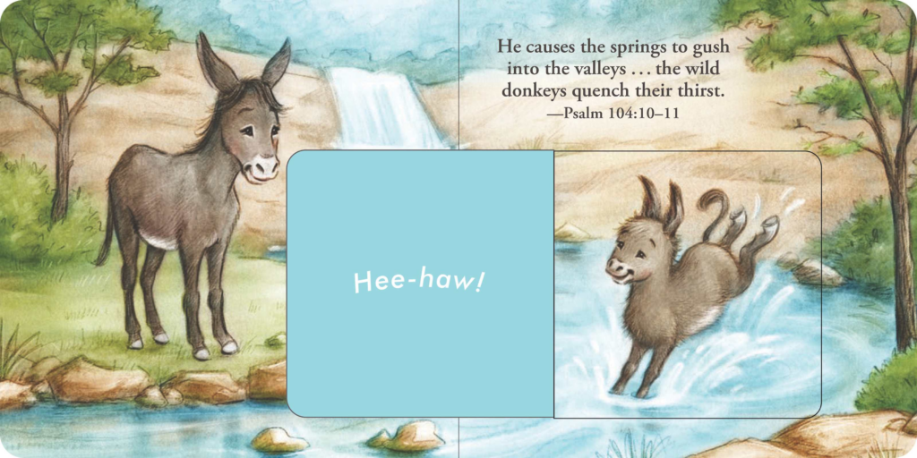 Toddlers will enjoy lifting the flaps, repeating the sounds, and learning that the Bible talks about creatures such as cattle, sparrows, lions, donkeys, rock badgers, sheep, eagles, snakes, horses, and whales.