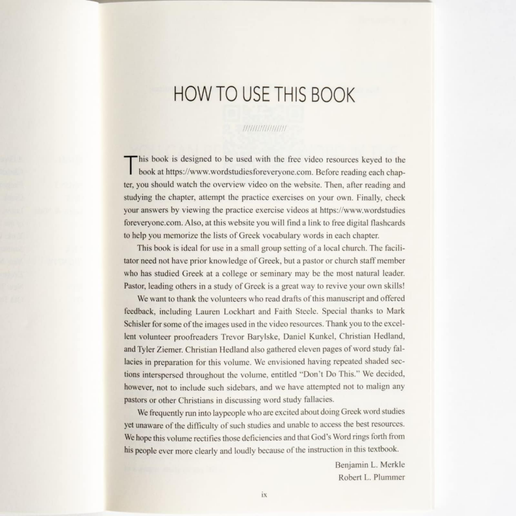 In no time, readers will master the essentials of reading Greek words, learn how to utilize word studies, and decipher between study tools. Whether you're studying solo or in a group setting, this 7-week church-based course format ensures steady progress. Packed with practice exercises and accompanied by free video lessons at wordstudiesforeveryone.com, Greek Word Studies for Everyone equips you to engage with the biblical text at the next level. Take the next step in your biblical studies journey today!