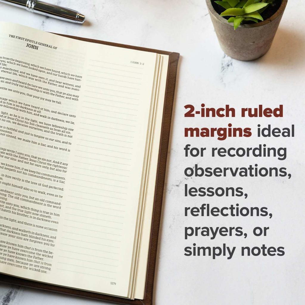 Enhance your personal Bible study or prepare for teaching and preaching with the KJV Notetaking Bible, Large Print Edition. This Bible features large 9.5-point type in a single-column setting with wide journaling margins on each page to make observations, raise questions, and inspire additional exploration of Scripture. This beautiful Bible provides the perfect place for insights, over time creating an incredible keepsake of your journey.