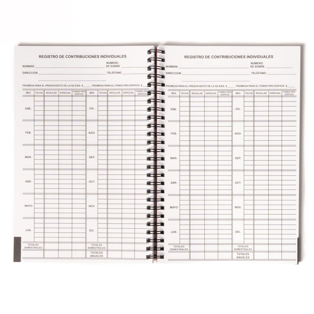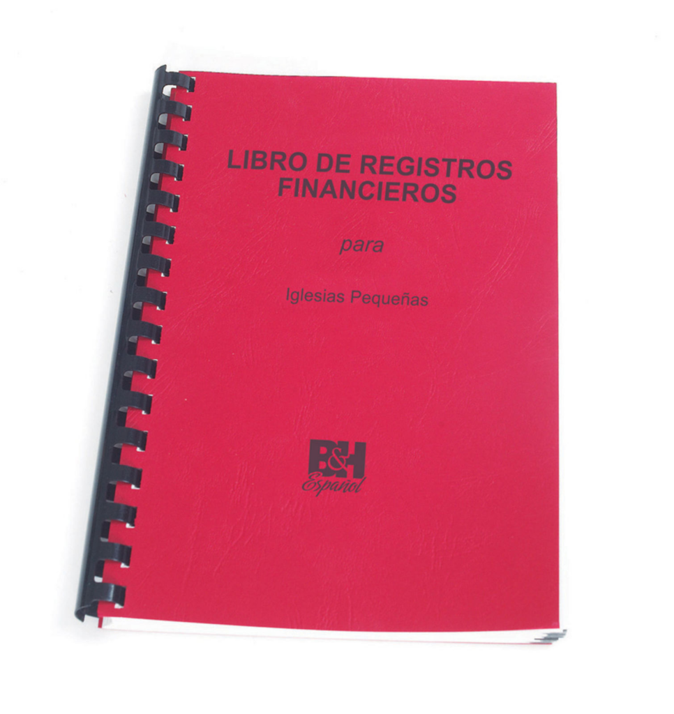 The Libro de registro financiero para iglesias pequeñas (Finance Record book for Small Churches) measures 5 3/16" x 9", and contains sufficient forms for churches of approximately 150 members for one year. It includes forms for church receipts, record of members' contributions, and disbursements.