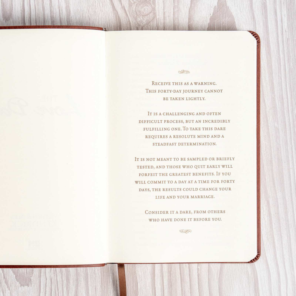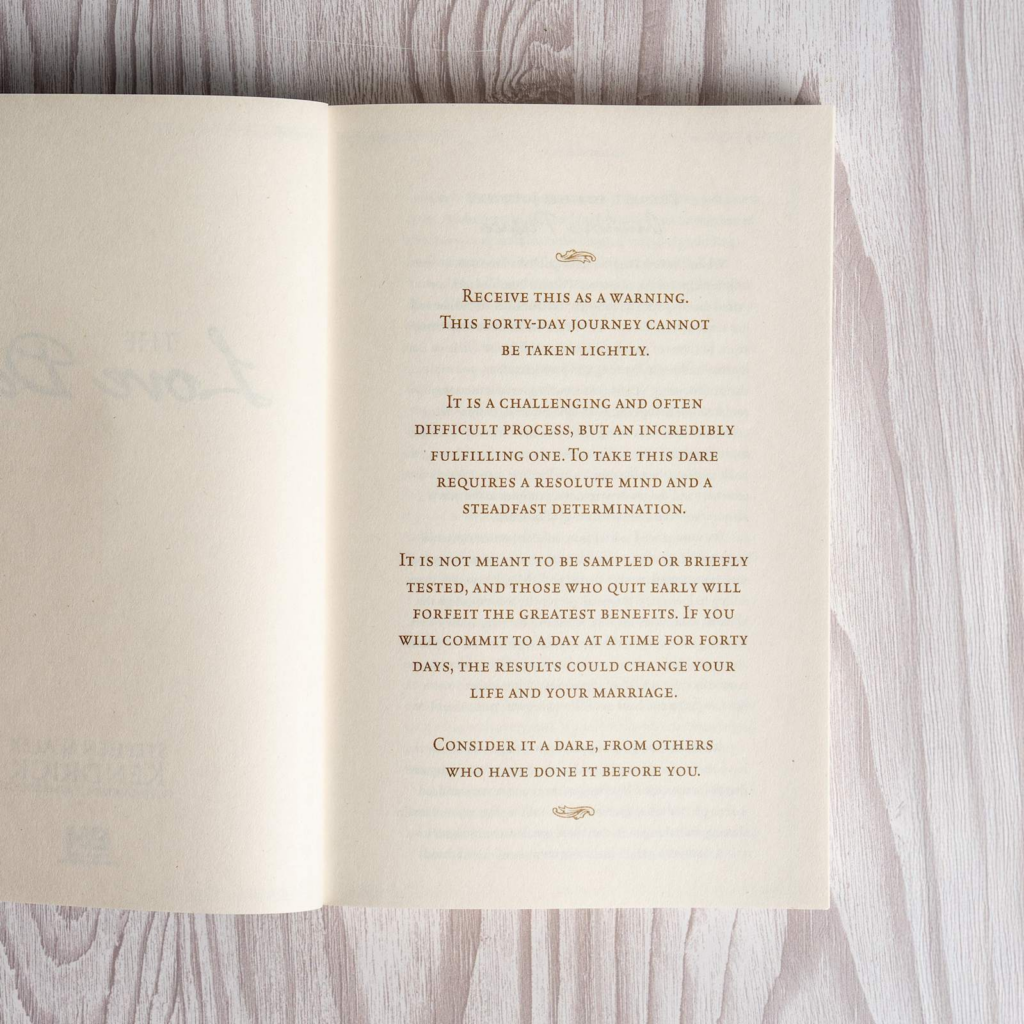 The Love Dare, New Revised Edition the New York Times No. 1 best seller that has sold five million copies and was major plot device in the popular movie Fireproof, is a 40-day challenge for husbands and wives to understand and practice unconditional love. Whether your marriage is hanging by a thread or healthy and strong, The Love Dare is a journey you need to take. It’s time to learn the keys to finding true intimacy and developing a dynamic marriage.