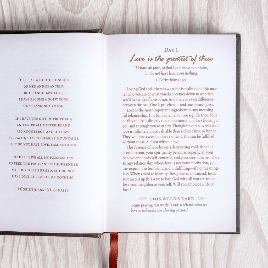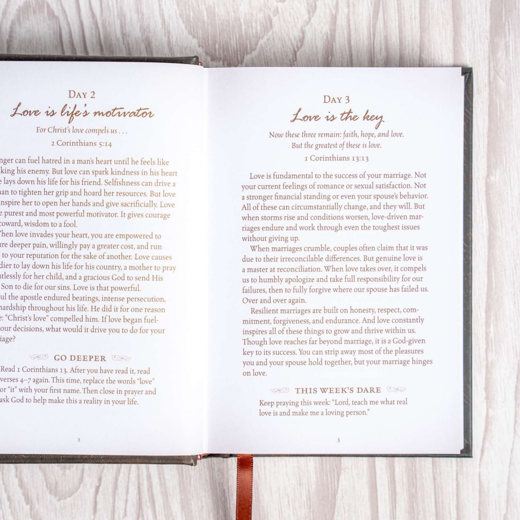 Love is a choice. A daily choice. The Love Dare Day by Day is a daily reminder of how it’s done . . . and done well, taking the original experience to the next level. With 52 weekly dares, this one-year devotional invites you to go deeper into the scriptural principles of The Love Dare, and is meant to enrich your relationship with God and your spouse through a daily time of reading, prayer, and action.