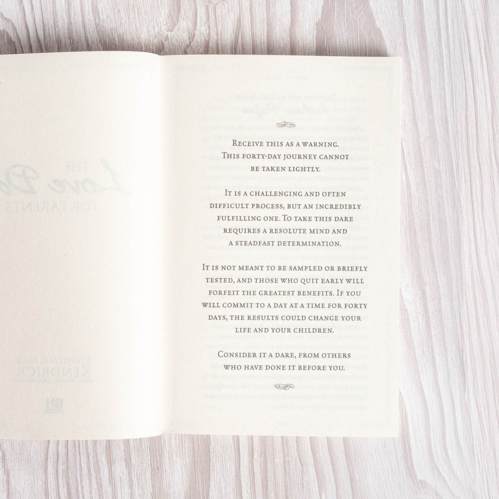 Each day brings a promising key verse from Scripture, a biblical principle about love that applies to parenting, a specific challenge the parent does for the sake of their child, and space to journal thoughts and reflect on what happened that day.