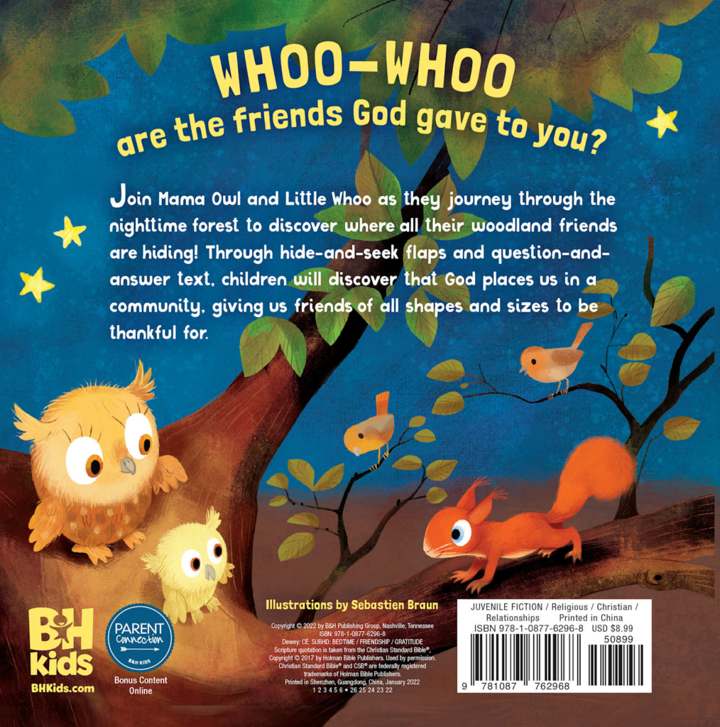 In this slightly bedtime flap book, Mama Owl asks Little Whoo to begin the night by thanking God for their forest friends. As the two owls travel through the woods, young readers will guess which animal is hiding in each scene as Mama Owl asks questions like: